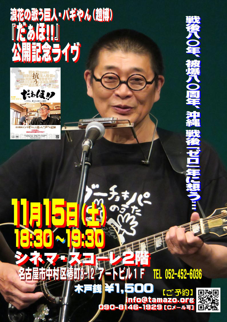 映画『だぁほ!!』上映 名古屋 シネマスコーレ ![]() ![]() 11月15日(土)、16日(日)、18日(火)、19日(水)、20日(木)、21日(金) 《上映時間》 11月15日/15:50~ ☆パギやん舞台挨拶/17:50~ ☆パギやんライブ&トーク/18:30~(↓参照/別料金) 11月16日/17:00~ 11月17日[休映] 11月18-21日/17:00~ シネマスコーレ 名古屋市中村区椿町8-12 アートビル1F TEL 052-452-6036 |