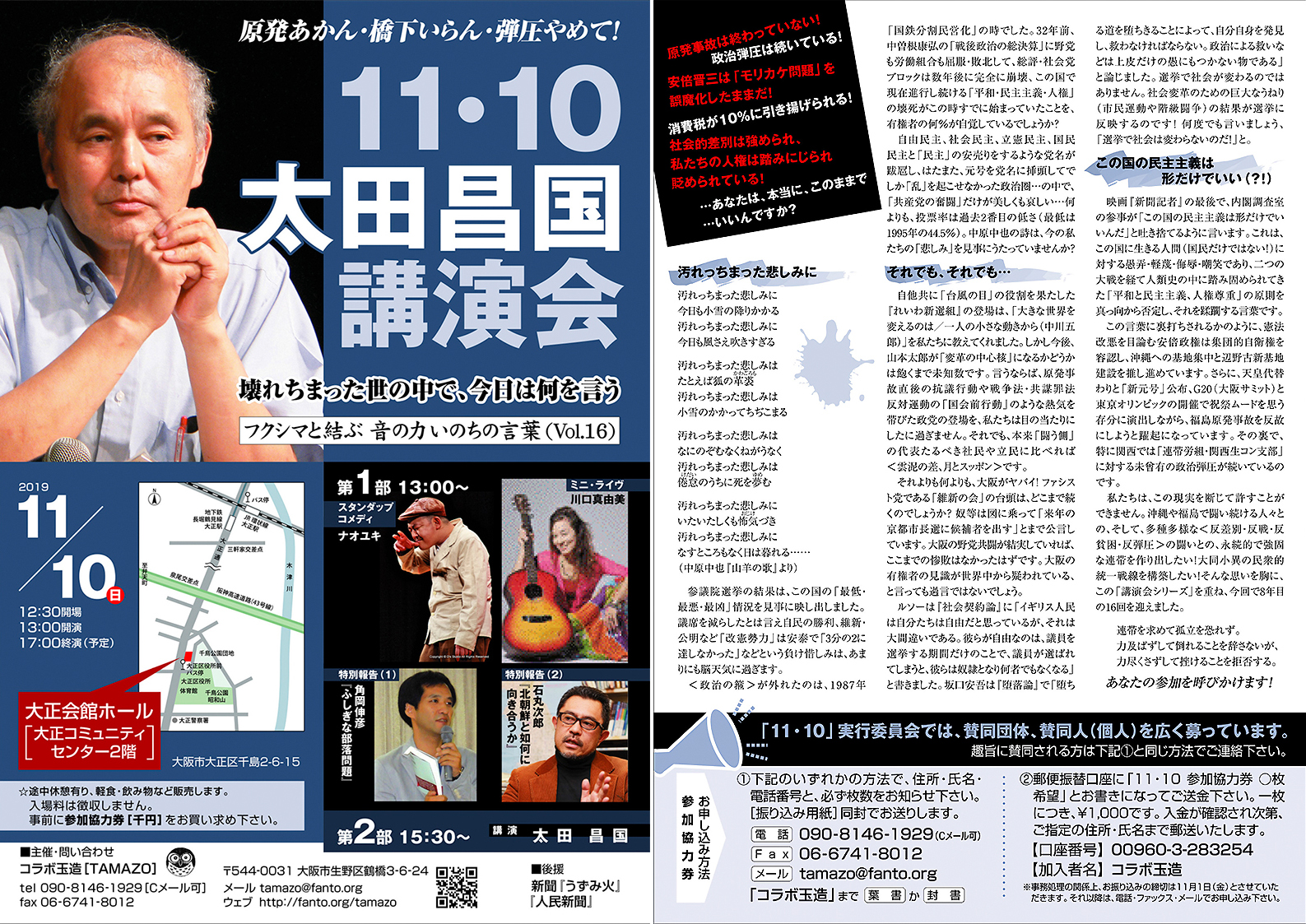 11月10日(日) 12:30開場 13:00開演 17:00終演大正会館(大正区コ ミュニティセンター)ホール 大阪市大正区千島2-6-15 TEL 06-6553-5511 参加協力券 1000円 問合せ・予約 tamazo☆fanto.org ☆を@に変えてください。 |