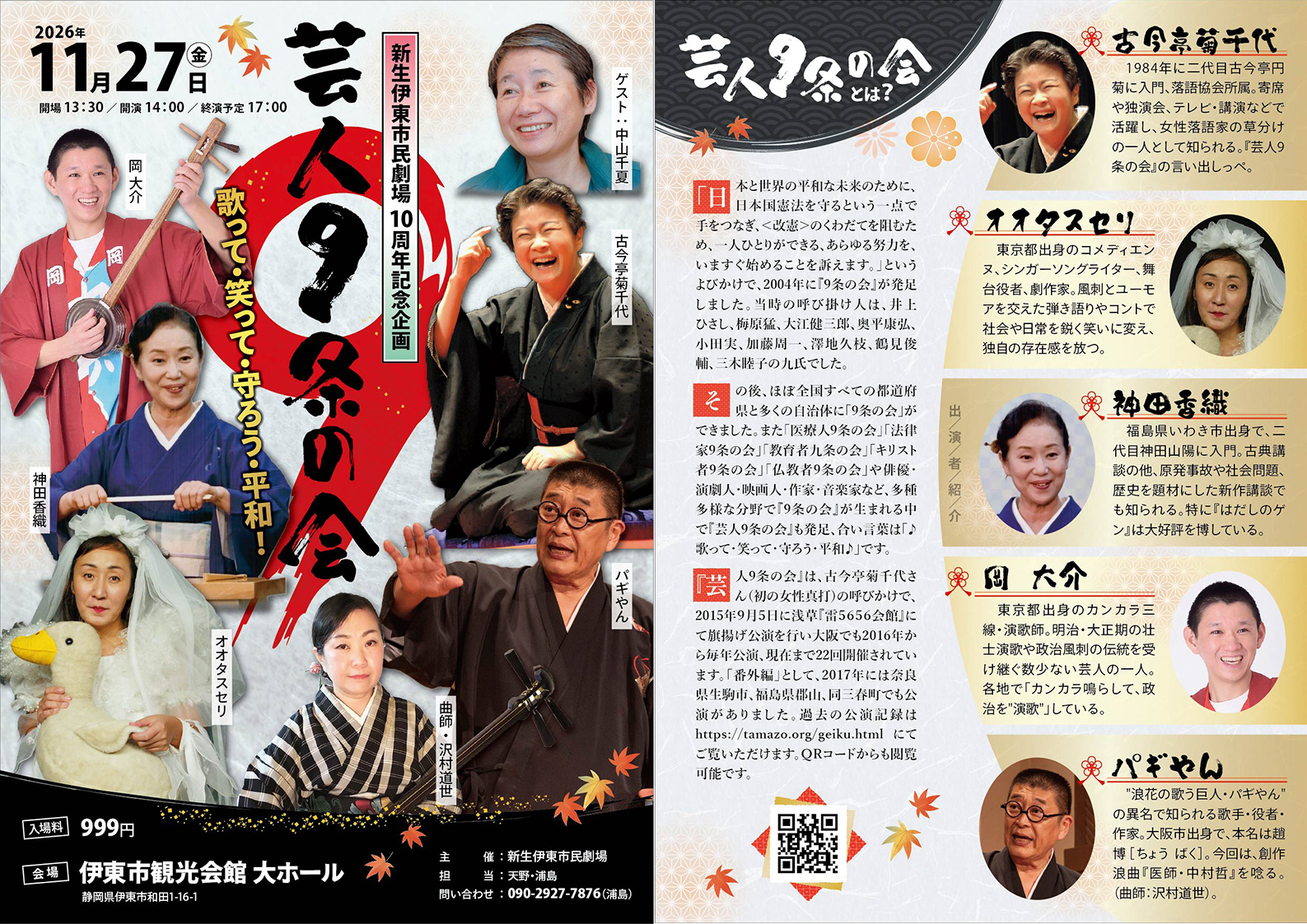 「芸人9条の会」は、古今亭菊千代さん(初の女性真打)の呼びかけで、2015年9月5日に浅草『雷5656会館』にて旗揚げ公演をいたしました。大阪では、2016年から毎年5月に公演しております。「番外編」として、2017年には奈良県生駒市、福島県郡山、同三春町でも公演させていただきました。 ご要望あれば、あなたの町や村にも「芸人9条の会」は参りますよ! ♪ 歌って・笑って・守ろう平和 ♪
