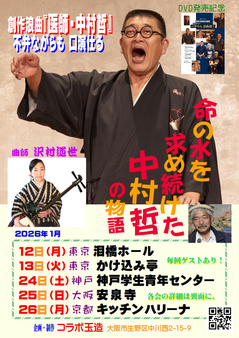 創作浪曲『医師・中村哲』⑤ ゲスト:幸助・福助/曲師:沢村道世 ![]() ![]() 1月25日(日) 16:00開演 安泉寺 大阪市生野区桃谷3-16-26 TEL 06-6731-4907 ◎投げ銭! [予約] info☆tamazo.org ☆を@に変えてください。 |