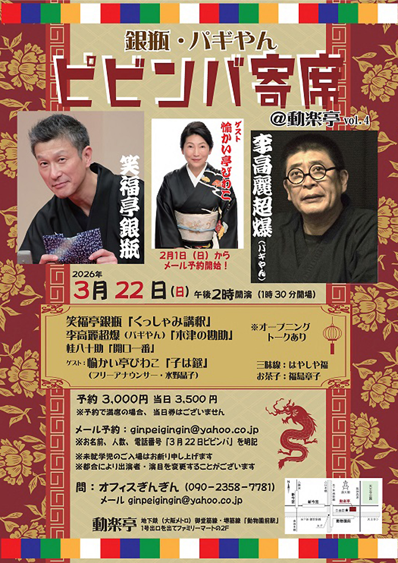 ピビンバ寄席@動楽亭 Vol.4 w/笑福亭銀瓶、愉かい亭びわこ ![]() 3月22日(日) 13:30開場 14:00開演 動楽亭 大阪市西成区山王1-17-6 [木戸銭] 3000円(予約・当日共) ※予約で満席の場合、当日券はございません。 [予約] info☆tamazo.org ☆を@に変えてください。 |