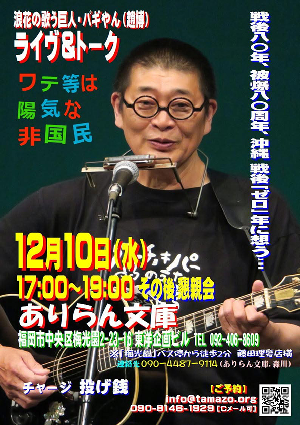 ”ワテ等は陽気な非国民” 12月10日(水)17:00~19:00 ありらん文庫 福岡市中央区梅光園2-23-16 東洋企画ビル 092-406-8609 ◎投げ銭! [予約] info☆tamazo.org ☆を@に変えてください。 |